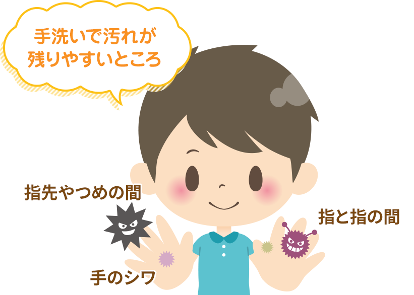指先、指の間、親指、手首は特に注意してしっかりと手洗いをしましょう。